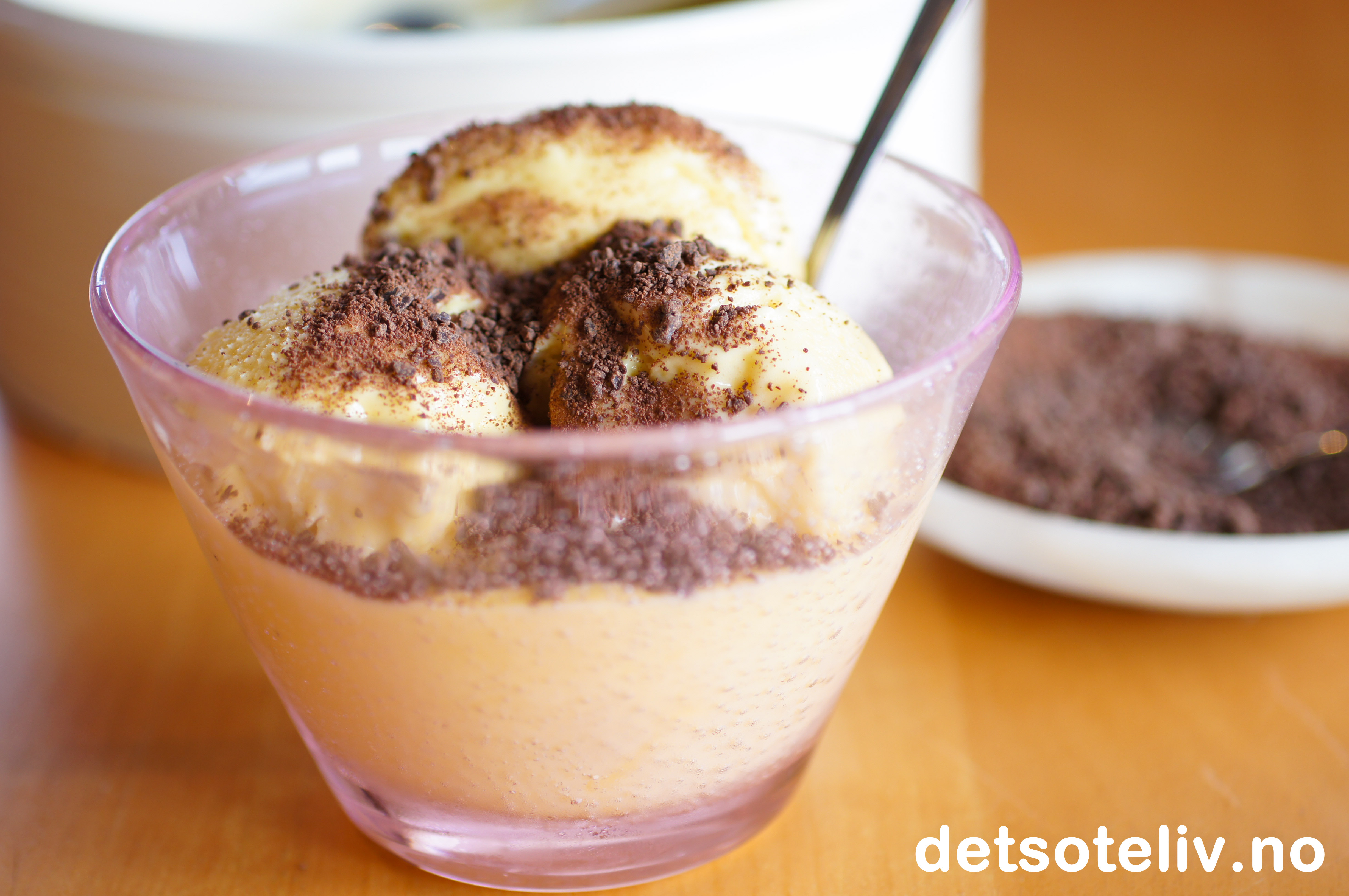 ♥ Denne iskremen er nokså hard i frossen tilstand, så beregn god tid før servering. Jeg tror jeg lot isen stå i romtemperatur i minst 20 minutter før den ble myk nok til at jeg kunne forme kuler.
