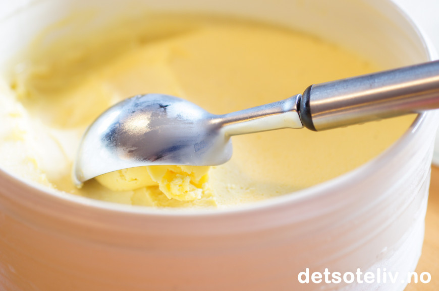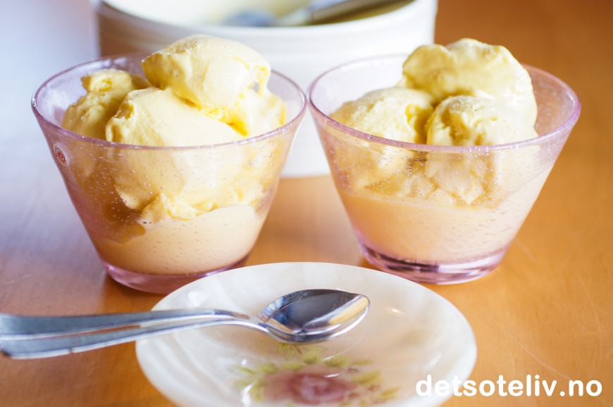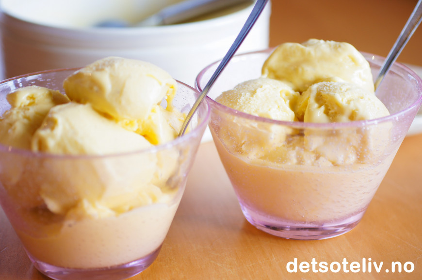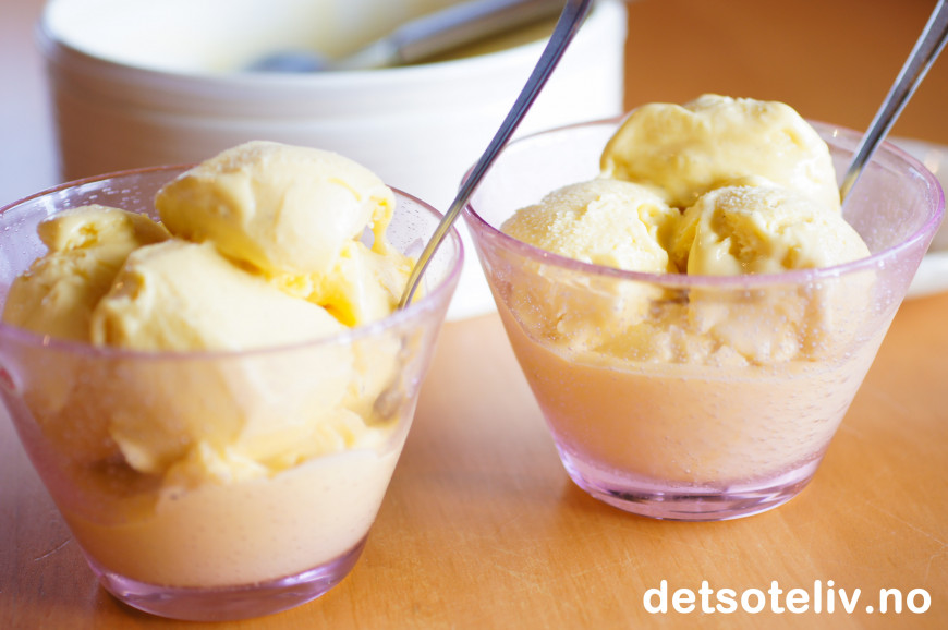 ♥ Vær nøye på å følge fremgangsmåten nøye, særlig oppvarmingsprosessen. Isen på bildet er laget i fryser og uten iskremmaskin. Det går helt fint!
