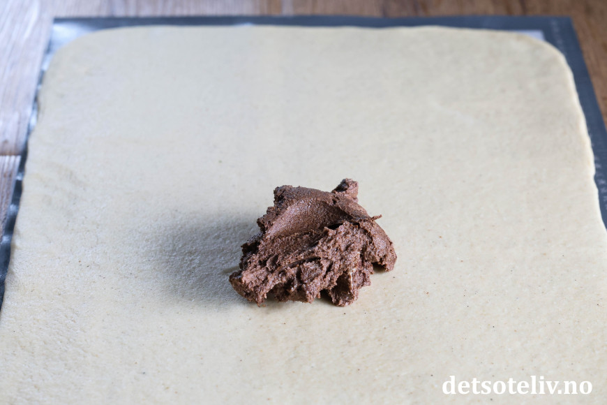 Kjevle ut deigen til en stor firkant, ca. 40 x 60 cm.