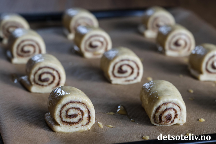 Straks bollene er tatt ut av ovnen, pensles de med varm sukkerlake. La bollene avkjøles mens du steker det andre brettet på samme måte.
