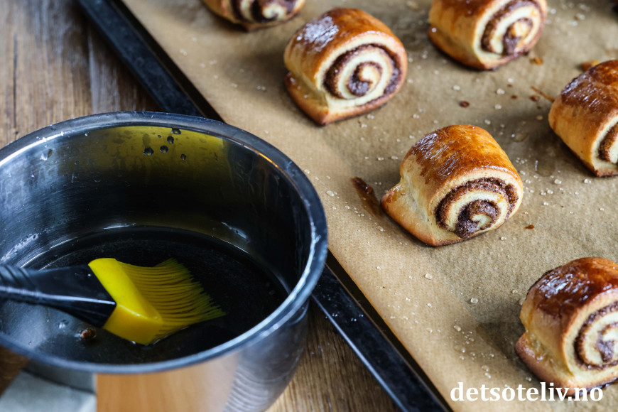 Straks bollene er tatt ut av ovnen, pensles de med varm sukkerlake.
