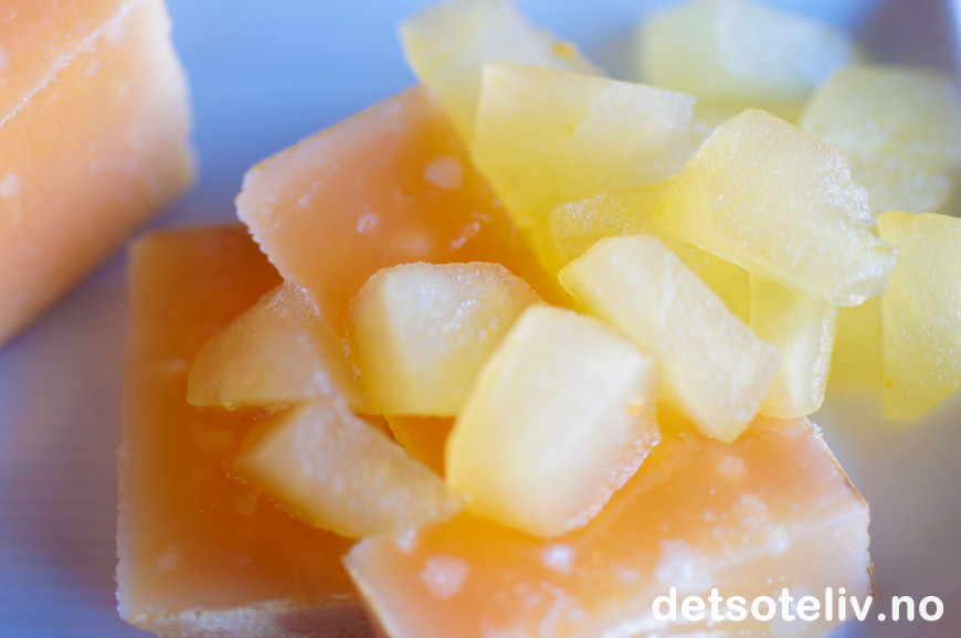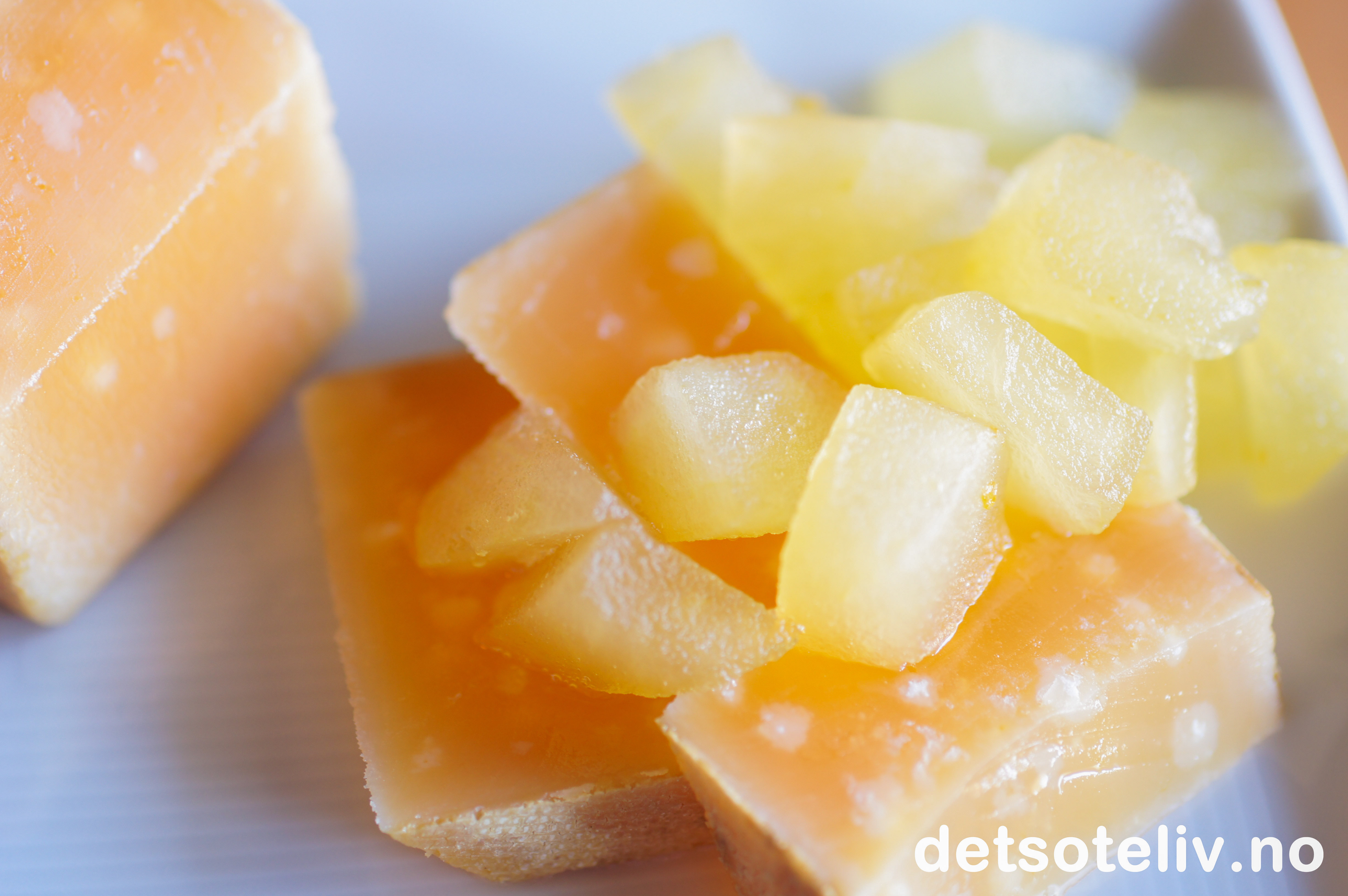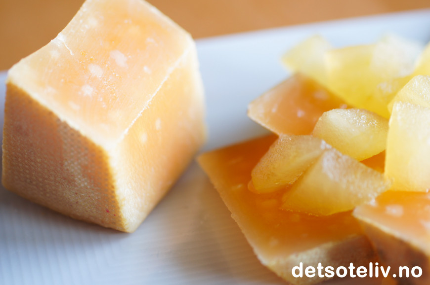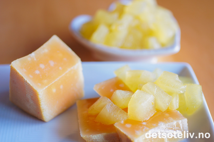 ♥ Glaserte eplebiter bør helst serveres samme dag de er laget. De er gode til mange slags oster. Jeg har her servert de glaserte eplebitene til rødkittsosten Holtefjell.