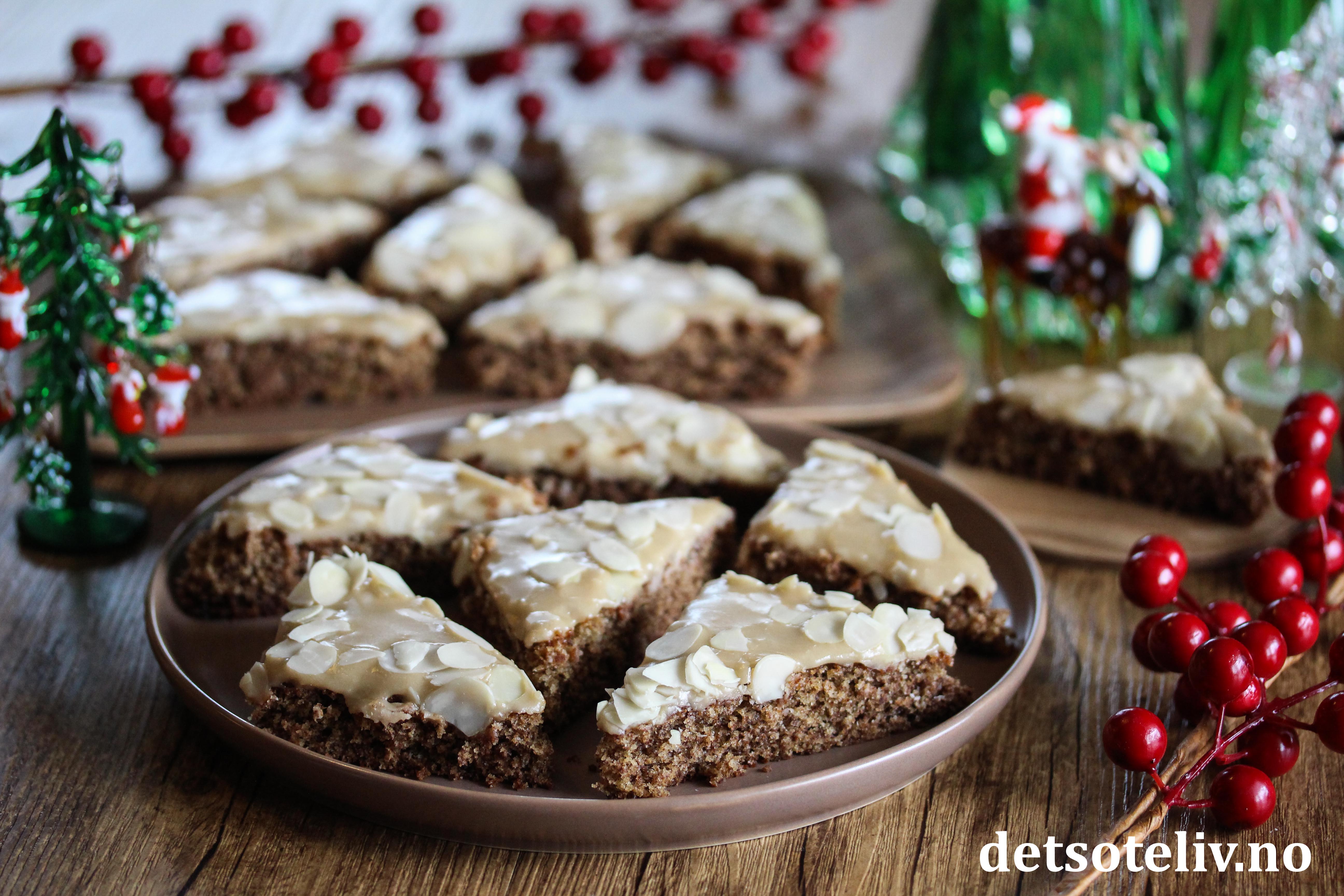 Her har du en NYDELIG langpannekake som får deilig smak av gløgg og sjokolade. Kaken er utrolig myk i konsistensen og smelter nærmest på tungen. Kaken pyntes med glasur laget av gløgg og melis og drysses med mandelflak.