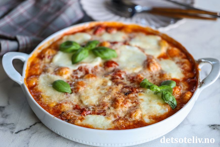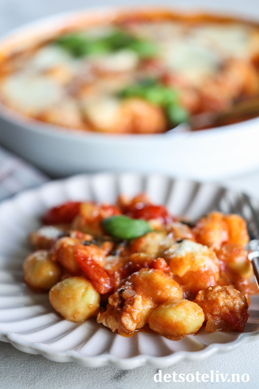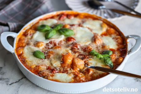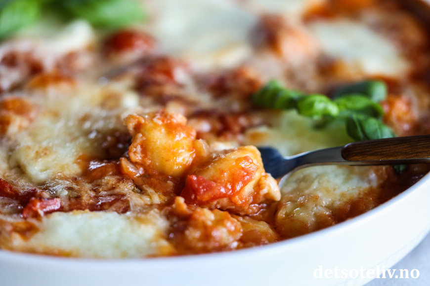 Gnocchi (som betyr "klumper") er små, italienske, pastalignende potetballer. Gnocchi bør selvfølgelig helst lages fra bunnen. Denne gangen brukte jeg ferdigkjøpte gnocchi, som også går veldig bra så lenge du velger en variant av god kvalitet. Gnocchi trekkes her i varmt vann i noen minutter, og ovnsbakes deretter i en deilig tomatsaus. På toppen rikelig med smeltet mozzarella og revet parmesan! Oh yes! 😍