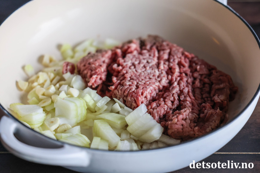 Varm opp et par spiseskjeer olivenolje i en stekepanne og ha kjøttdeigen i pannen. Hakk løk og hvitløk og ha også dette i pannen. Stek kjøttdeig og løk til kjøttdeigen er gjennomstekt og løken blank og gyllen.
