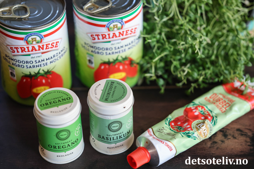 ♥ Bruk helst hermetiske tomater av god kvalitet. 400 gram tilsvarer 1 boks (800 gram er altså 2 bokser). Jeg brukte her San Marzano-tomater, som er søte og gode. Andre typer hermetiske tomater går selvfølgelig også helt fint å bruke, men du kan eventuelt tilsette 0,5 ts sukker i sausen dersom du bruker mer ordinær variant som ikke er like søt.