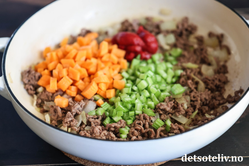 Skrell gulroten og skjær den i helt små terninger. Vask selleristangen og skjær også den i små terninger. Ha dette i pannen sammen med tomatpuré.