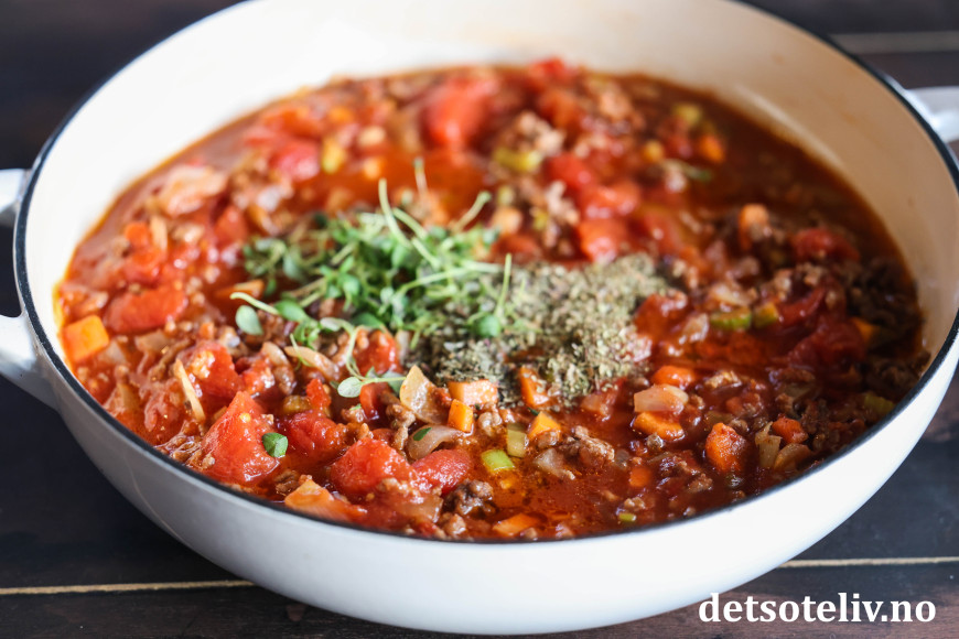 Bland godt og tilsett hermetiske tomater og tørkede og/eller friske krydderurter.