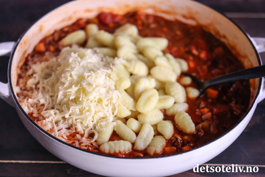 Ha til slutt revet mozzarella og gnocchi i pannen.