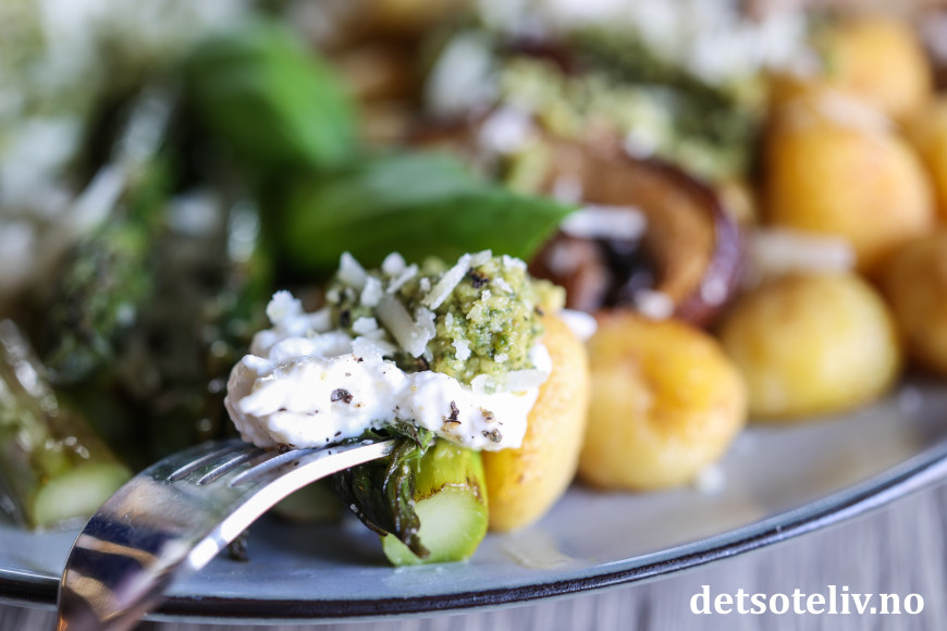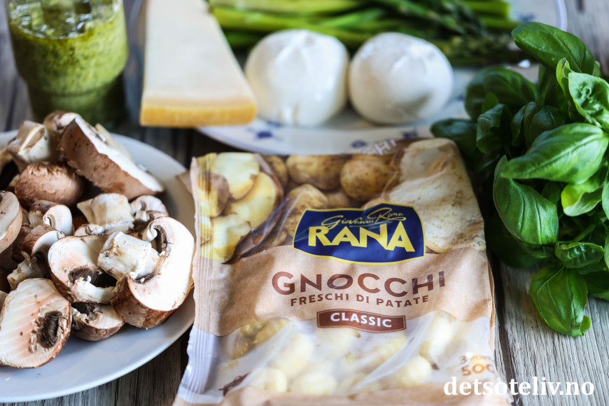 Her stekes gnocchi, sopp og grønne asparges i smør og hvitløk, og toppes deretter med hjemmelaget pesto, frisk basilikum og revet parmesan.