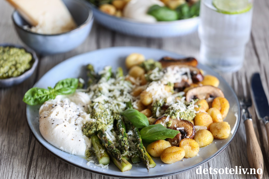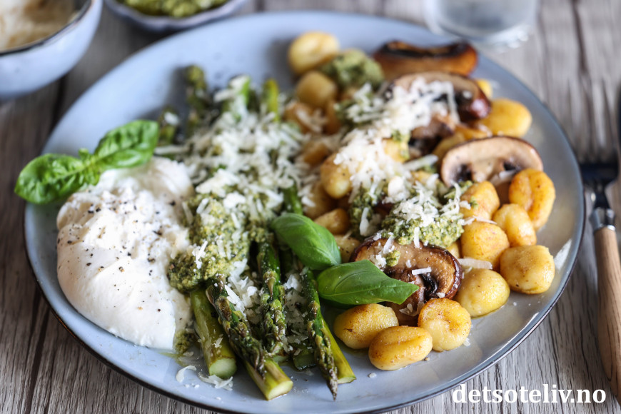 Ha stekte gnocchi, sopp og asparges på to tallerkener. Hell over resten av hvitløkssmøret i stekepannen som en saus. Legg en burrata på hver tallerken, snitt den opp og dra den litt fra hverandre slik at den åpner seg. Fordel et par skjeer hjemmelaget pesto over hver tallerken. Dryss over rikelig med revet parmesan. Kvern over salt og pepper. Pynt med frisk basilikum.