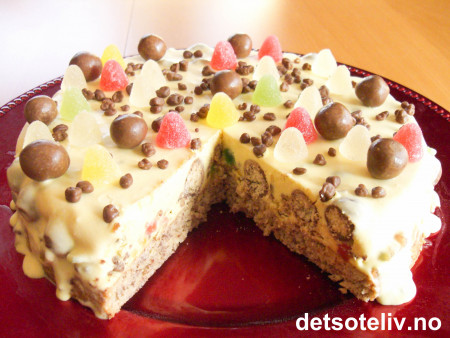 Pisk eggeplommer, sukker og vaniljesukker luftig. Pisk kremfløten til krem. Rør kremen inn i eggedosisen, slik at du får en klumpfri blanding. Vend så inn geletopper, Daimkuler og M-Krisp (hold av noe av godteriet til pynt).
