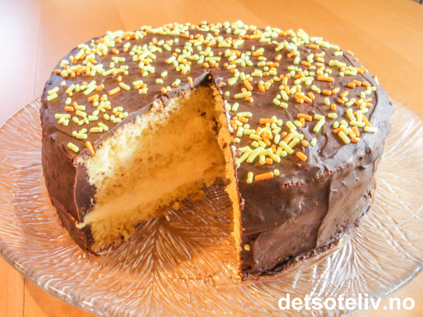 Ha deigen i en rund kakeform (24 cm i diameter) med bakepapir i bunnen. Stek kaken på rist midt i ovnen ved 150°C i ca 45 min. Avkjøl kaken i formen. Løsne den fra formen og fjern bakepapiret.