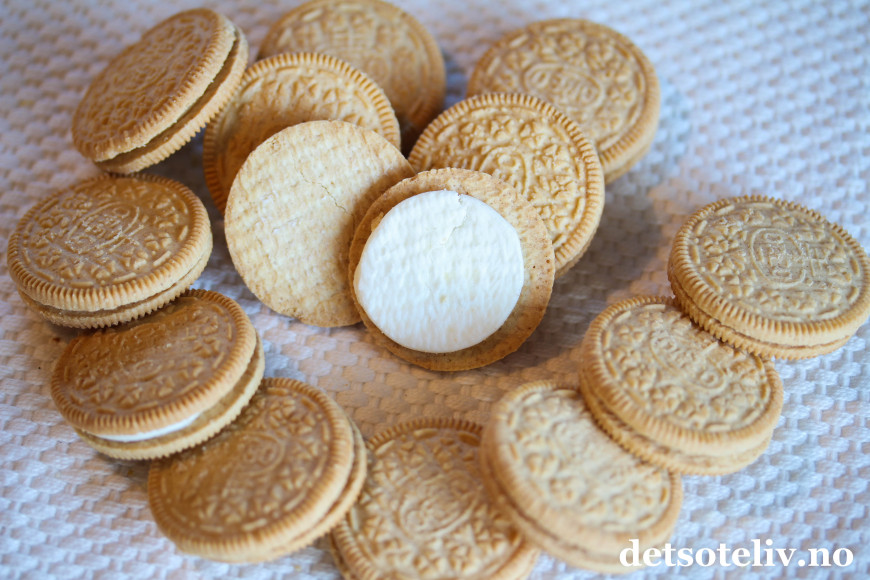 Når du skjærer opp kakene, ser du at det er vaniljekjeks med vaniljekremfyll i bunnen.
