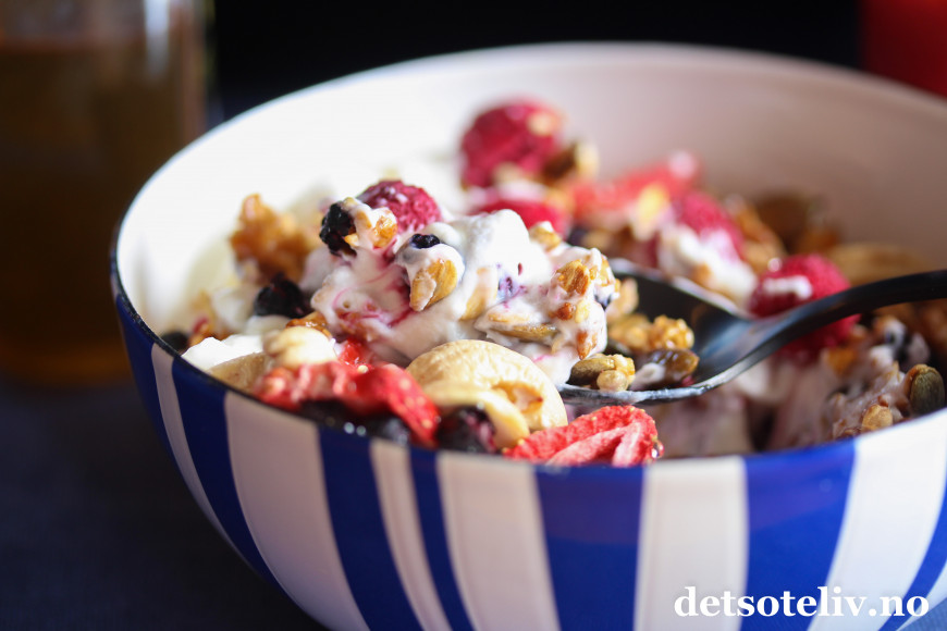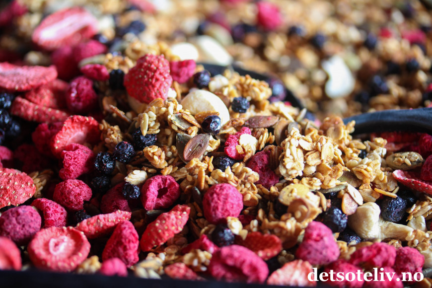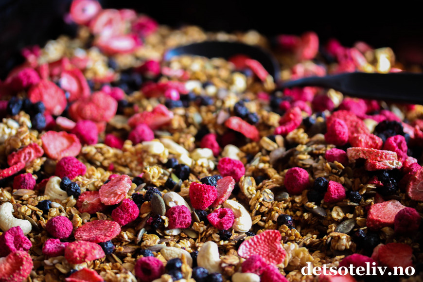 Det finnes allerede flere varianter her på bloggen. Denne gangen har jeg brukt kjempegode cashewnøtter og masse tørkede, fargerike bær, som jeg kjøpte i en helsekostforretning.