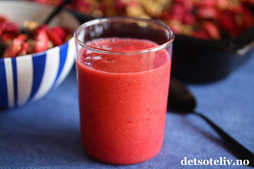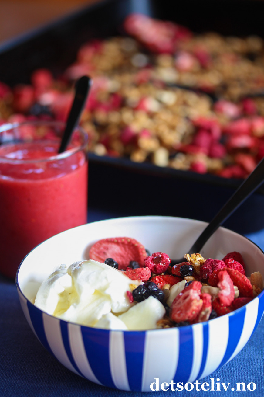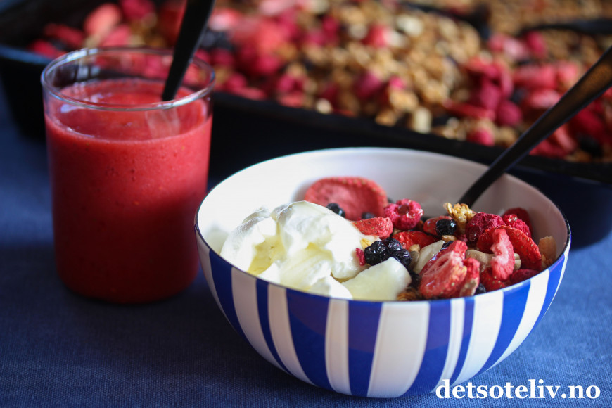 Denne smoothien sammen med granolaen smaker godt til frokost, men også til lunsj og gjerne til kvelds også, spør du meg...