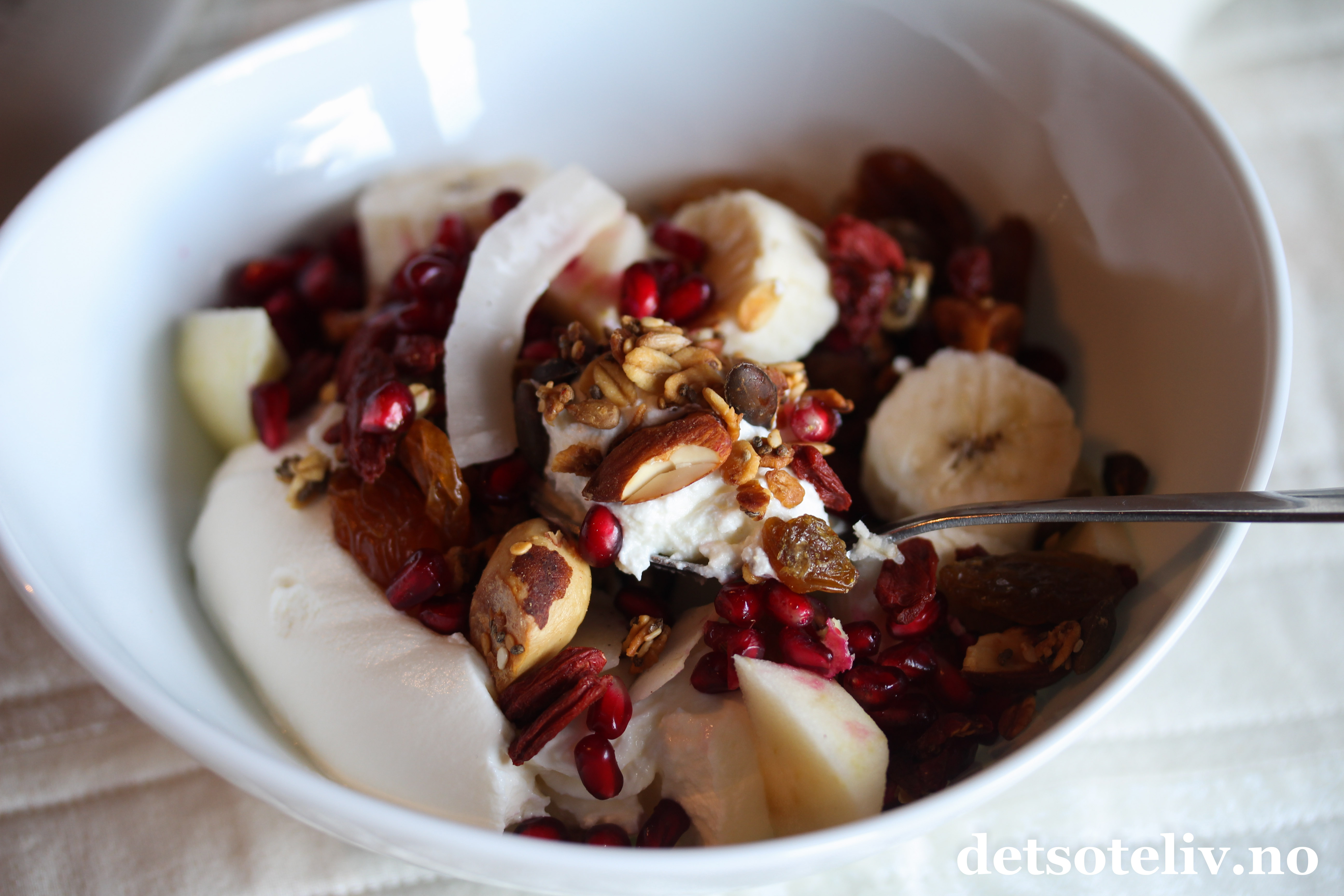 Jeg synes denne granolaen smaker supert til gresk yoghurt og topper gjerne med banan, pærebiter og granateplekjerner.