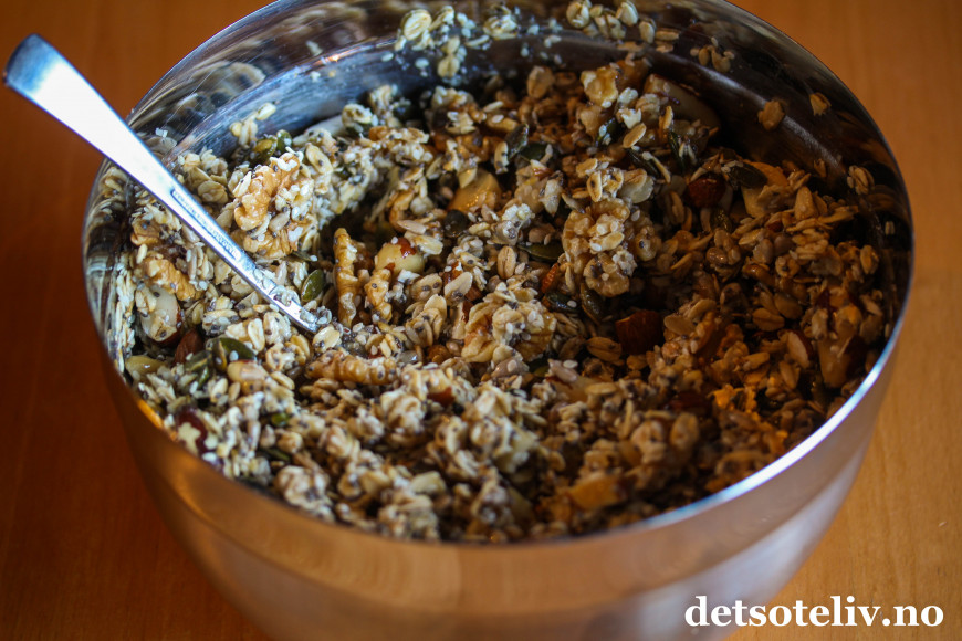 Bland sammen havregryn, nøtter, solsikke- og gresskarkjerner, sesamfrø og chiafrø i en stor bolle. Hell over eplejuicesirupen og rør så alt blir godt blandet.