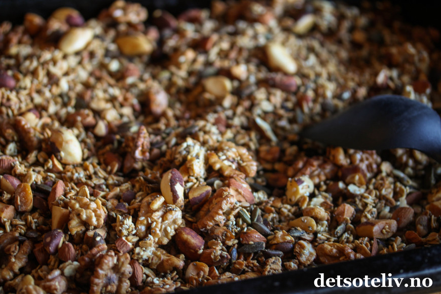 Finn frem en langpanne og pensle den lett med litt solsikkeolje. Ha så alt innholdet fra kjelen oppi langpannen og fordel det hele jevnt utover. Granolaen stekes midt i ovnen ved 150°C i ca. 50-60 minutter. Jeg tar langpannen ut av ovnen hvert kvarter for å snu og vende litt rundt på granolaen for å sikre at alt blir jevnt stekt.