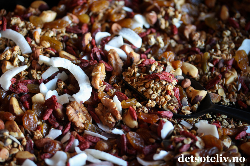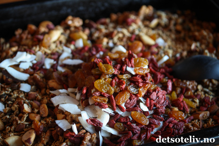 Ta langpannen med den ferdigstekte granolaen ut av ovnen og avkjøl blandingen. Vend først da inn rosiner, gojibær og kokosflak.