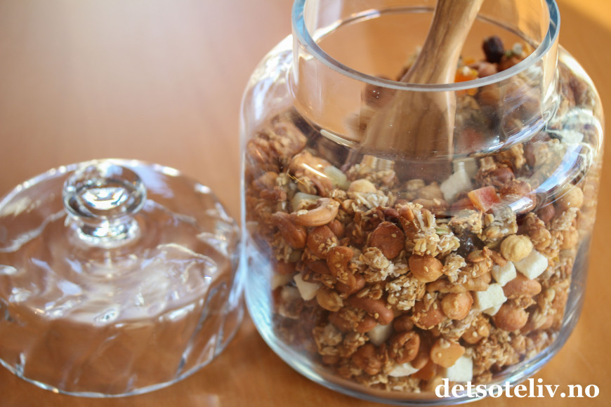 Ha den ferdige granolaen på egnet glass eller beholder.