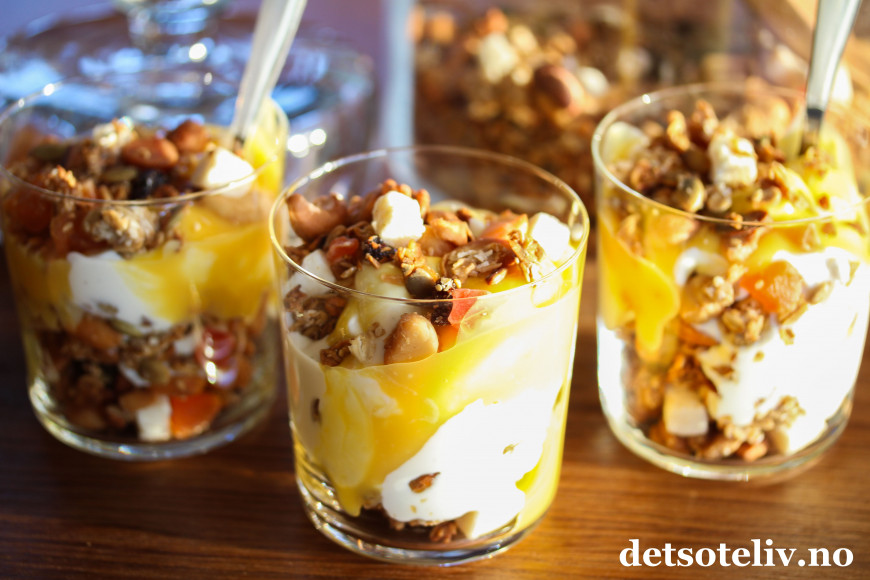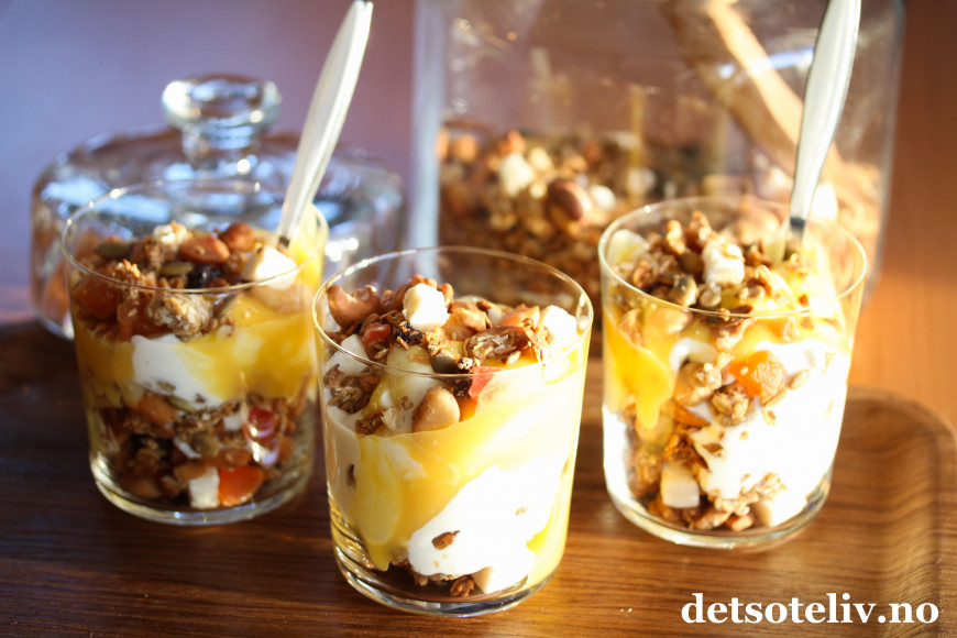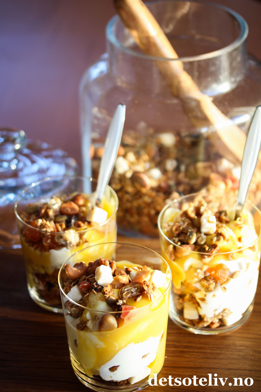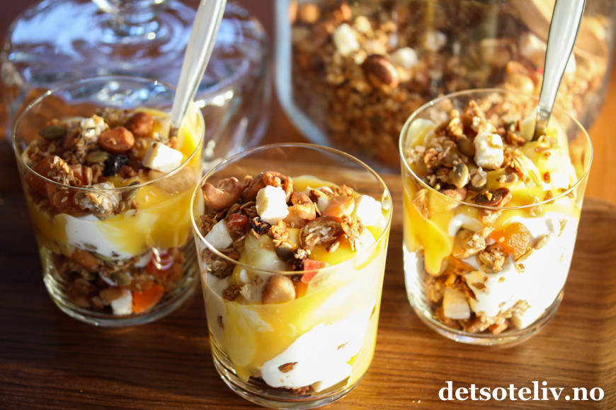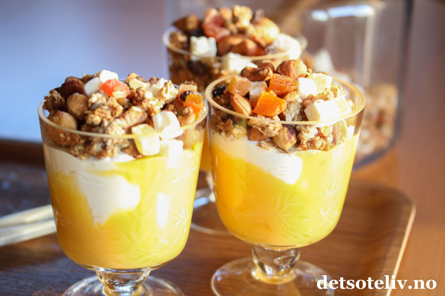 Serveres med gresk yoghurt og gjerne et tropisk syltetøy eller hjemmelaget pasjonsfruktkrem, som du finner oppskrift på HER.