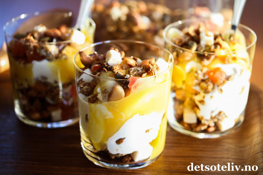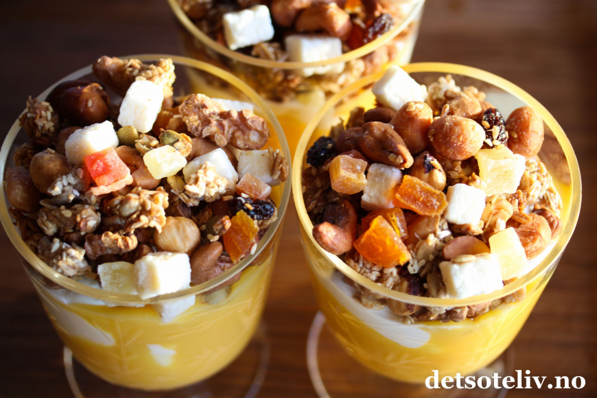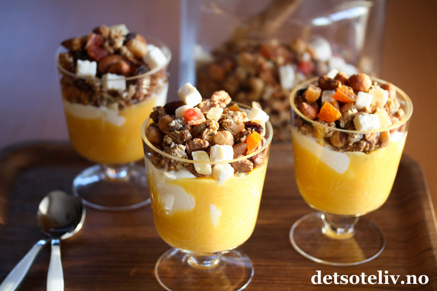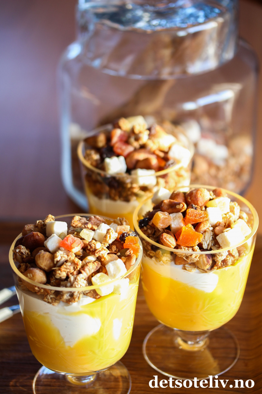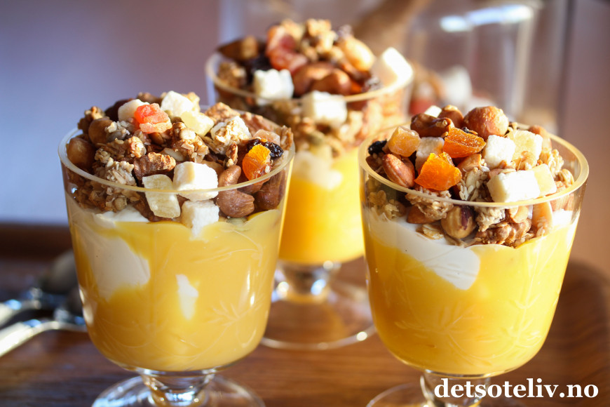 Serveres med gresk yoghurt og gjerne et tropisk syltetøy eller hjemmelaget pasjonsfruktkrem, som du finner oppskrift på HER.