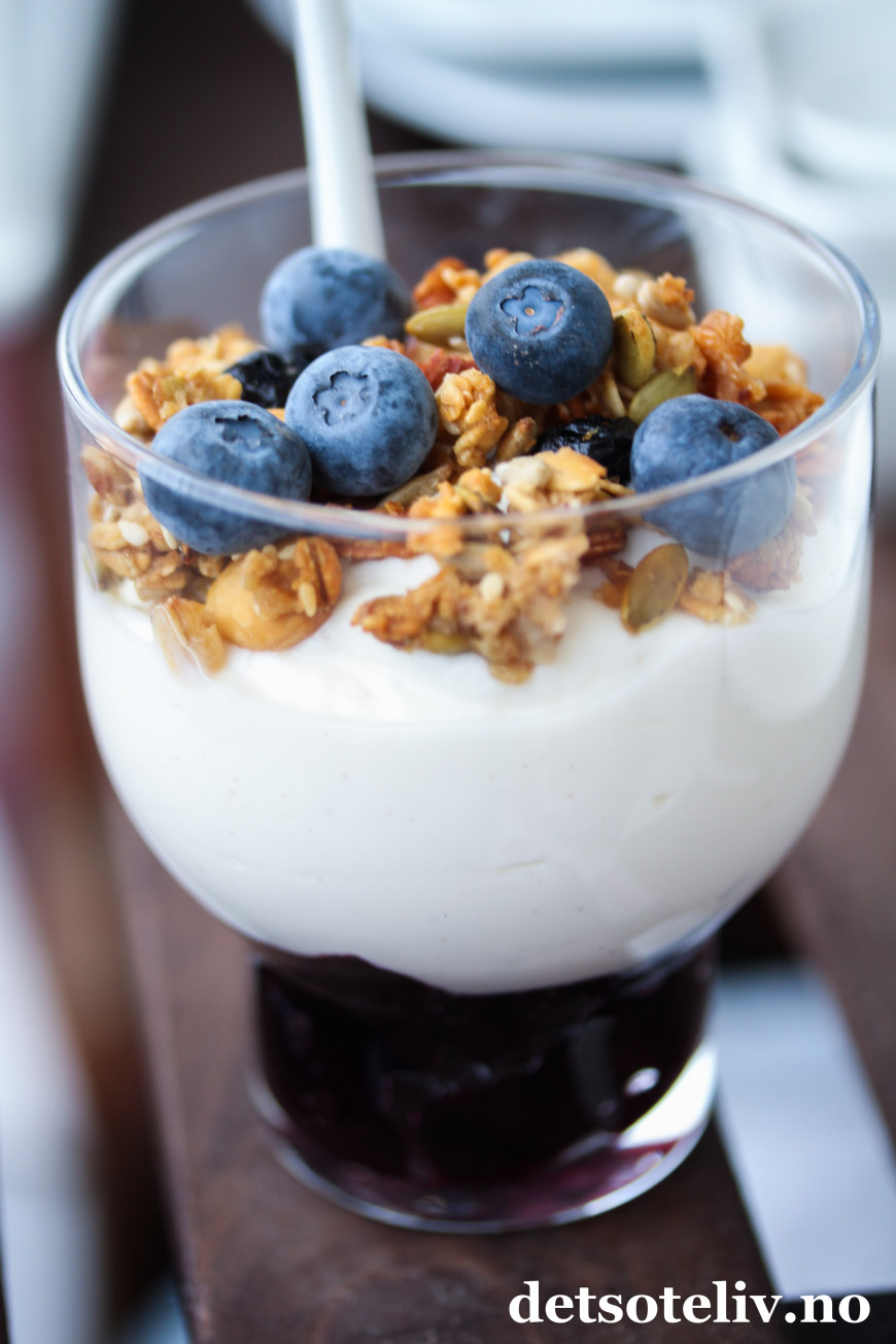 Serveres med blåbærsyltetøy og gresk yoghurt - og med friske blåbær på toppen!