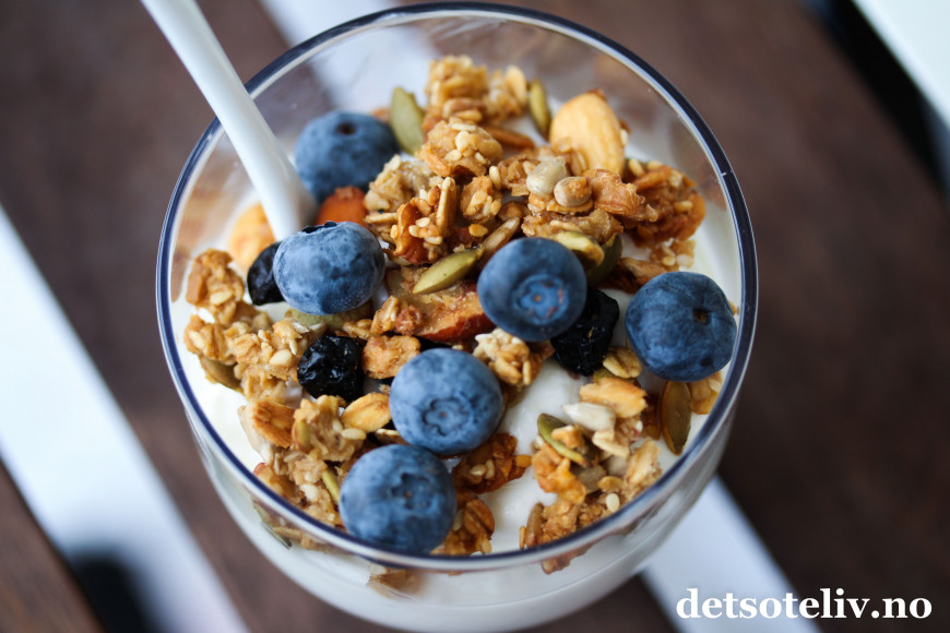 Vend først da inn tørkede blåbær. Ha den ferdige granolaen på egnet glass eller beholder.