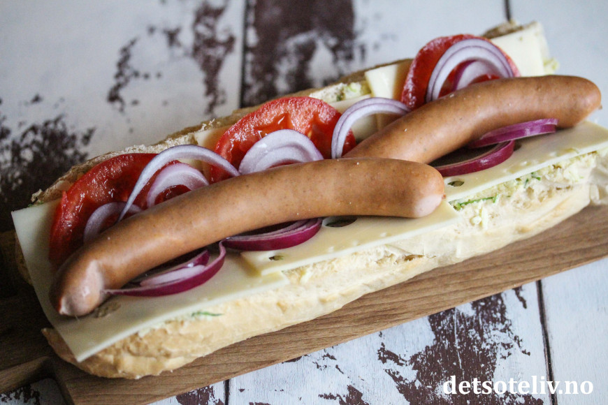 ♥ Jeg har her brukt en halv stor baguette (ferdigkjøpt). Som du ser fikk jeg ikke plass til 2 hele pølser, men porsjonen blir stor nok for det! 😊 Du kan eventuelt dele en stor baguette i tre deler og ha 1 pølse i hver del, og for øvrig doble ingrediensene til fyllet.