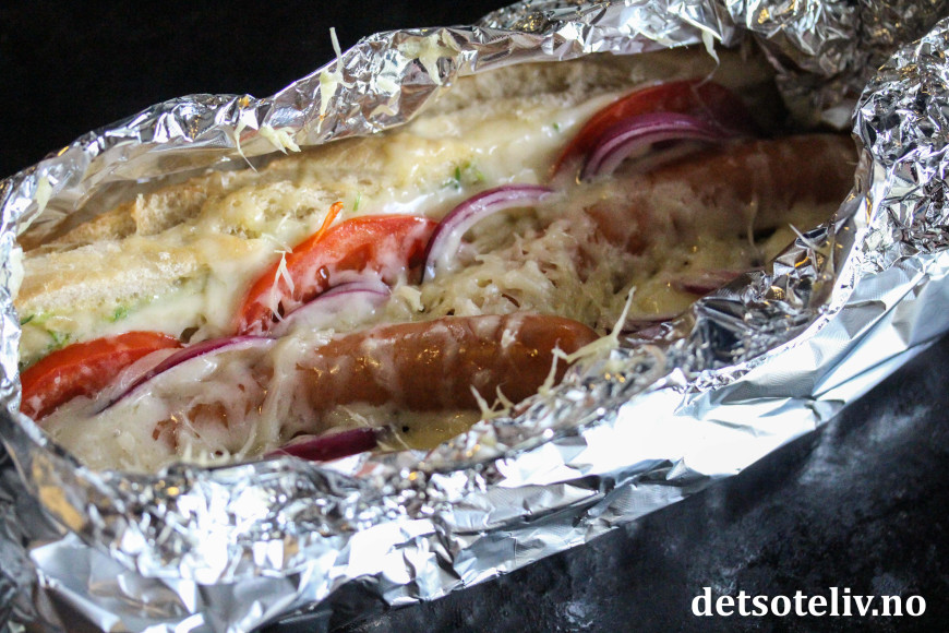 Men det som ble satt på bordet var nok langt mer fancy enn som så! For inn kom en halv baguette fylt med to saftige pølser, tomat, løk og en nydelig ost- og sennepskrem, og så var det hele gratinert med en smakfull ost på toppen.