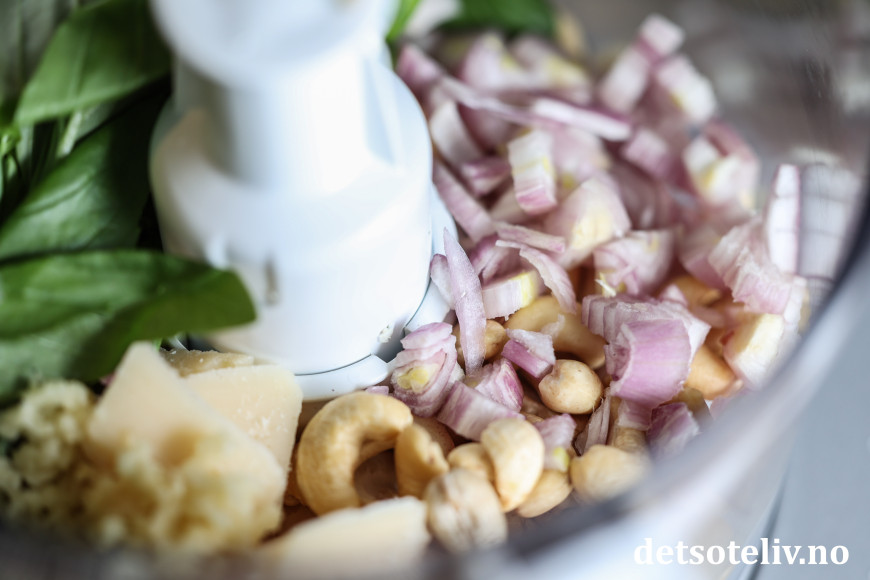 Ha halvparten av spinatbladene, frisk basilikum (blad og stilker) og cashewnøttene i en food processor. Brekk parmesanosten i biter og ha i. Press hvitløksfeddene og hakk sjalottløken, og ha også dette i food processoren.