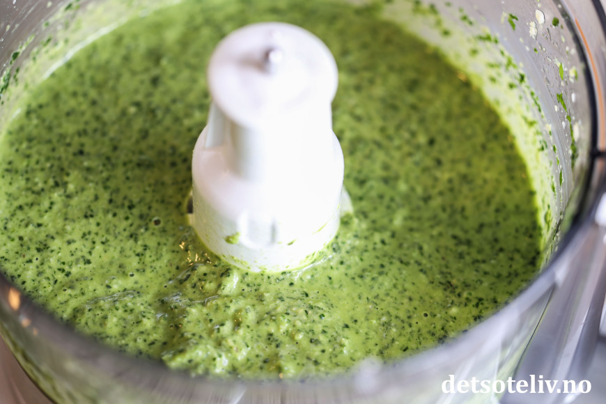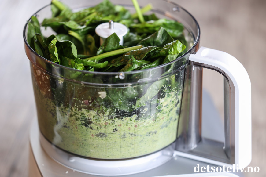 Tilsett resten av spinatbladene og olivenoljen og kjør videre til du får en glatt, grønn dressing.