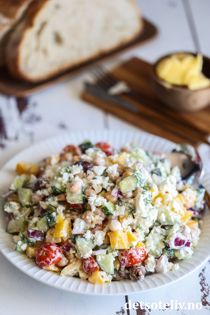 Dette er en lettlaget og nokså mettende kikertsalat med greske smaker. Skylte kikerter blandes her med agurk, gul paprika, små tomater og rødløk. Oliven og feta gir det greske preget på salaten, og det samme gjør den deilige, kremete tzatziki-dressingen.