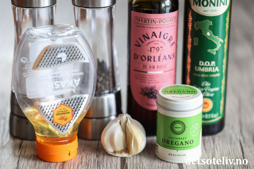 Bland olje og rødvinseddik. Press hvitløksfeddet i hvitløkspresse og tilsett. Rør inn flytende akasiehonning.