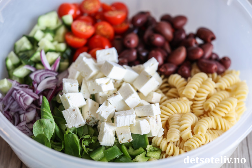 I tillegg til pastaskruer, blandes salat, agurk, småtomater, rødløk og grønn paprika med fetaost, oliven og en smakfull Gresk vinaigrette.