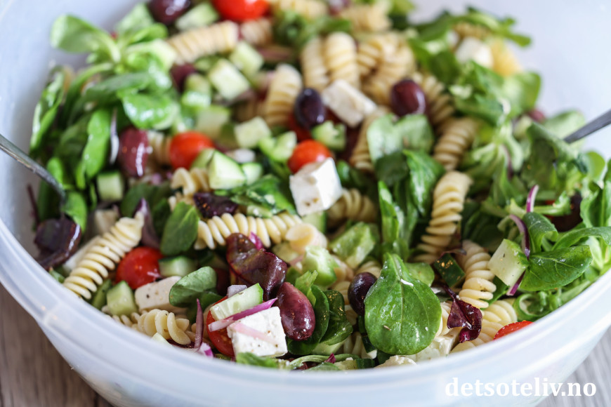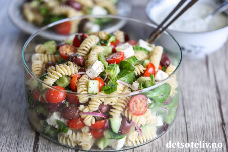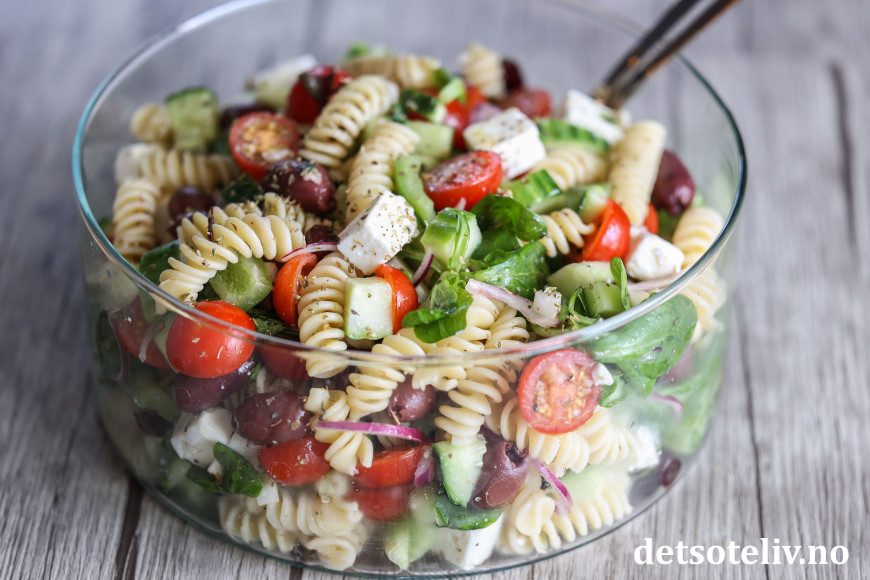 Gresk pastasalat er dessuten perfekt å sette frem på koldtbordet, og restene er herlige å ha i matpakken dagen etter.