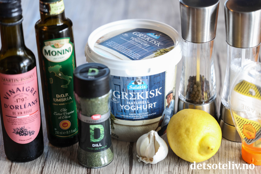 Jeg serverer den greske salaten sammen med en deilig Gresk yoghurtdressing med hvitløk og dill.