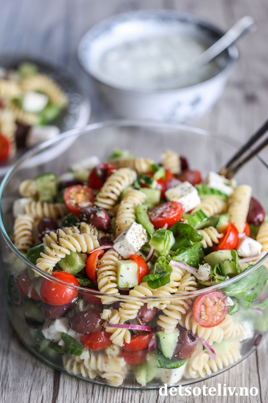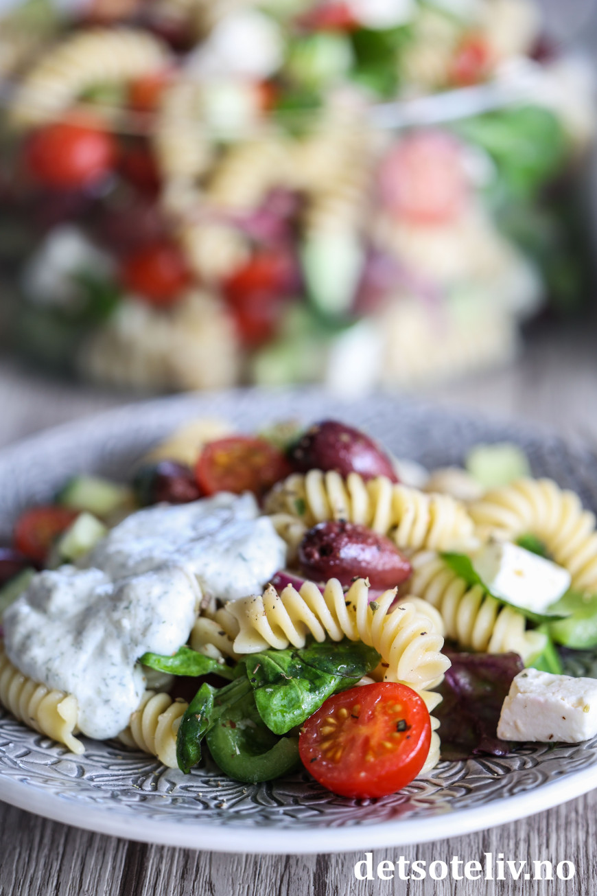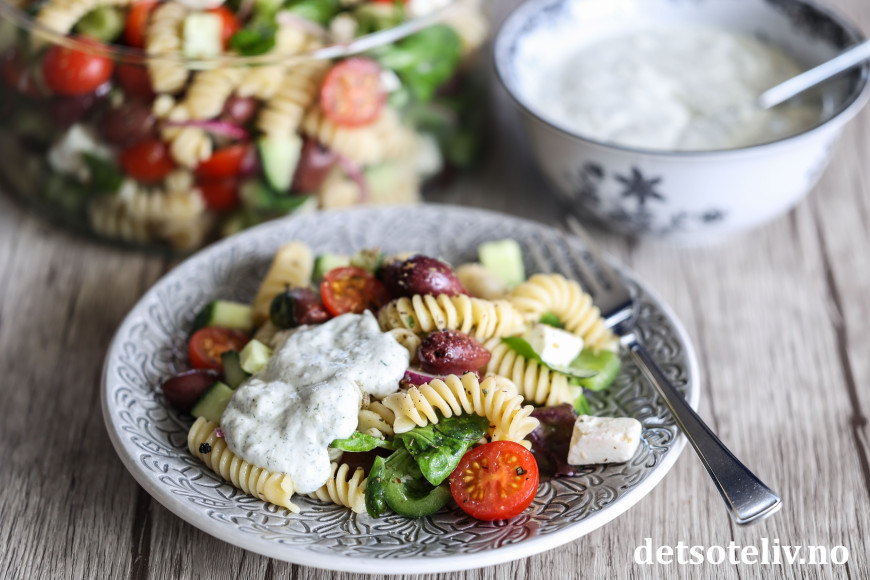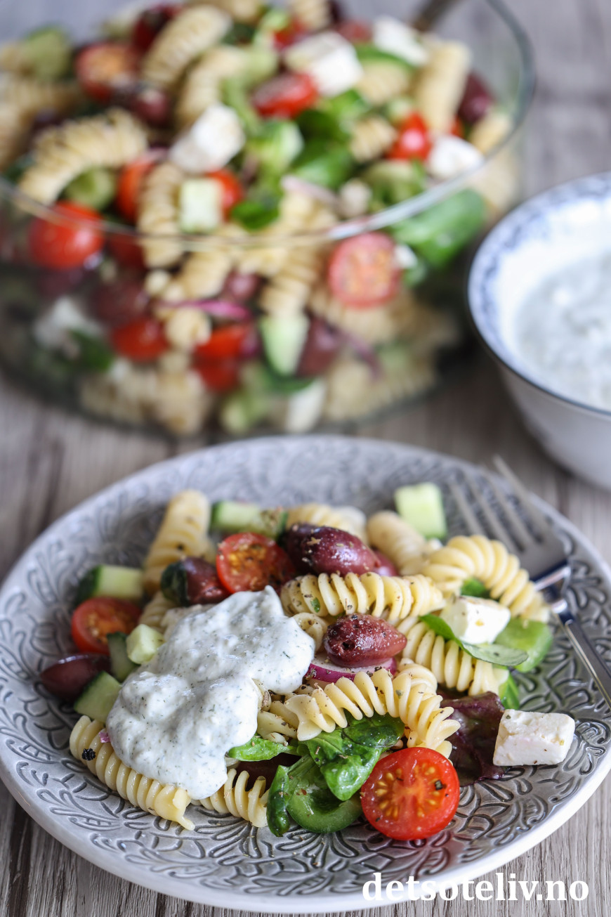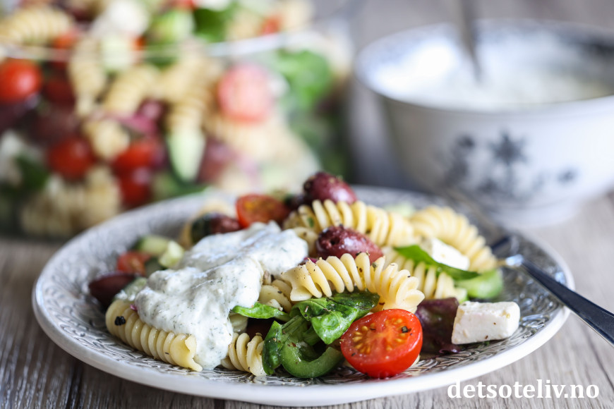 Yoghurtdressingen er kjempegod å servere sammen med den greske pastasalaten!