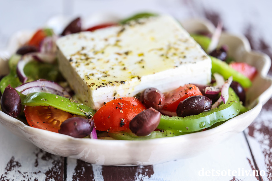 Autentisk, gresk salat lages med kun få ingredienser. Desto viktigere er det at de er av beste kvalitet. Det du trenger er solmodne tomater, agurk, tynne skiver løk, grønn paprika, gode oliven (gjerne kalamata) og selvfølgelig en skikkelig god fetaost.