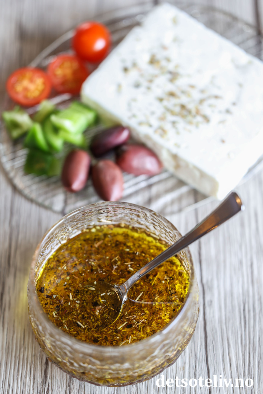 Kjempegod på klassisk Gresk salat (Horiatiki salata) eller en Gresk pastasalat, men også på en helt enkel, grønn salat.