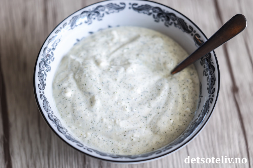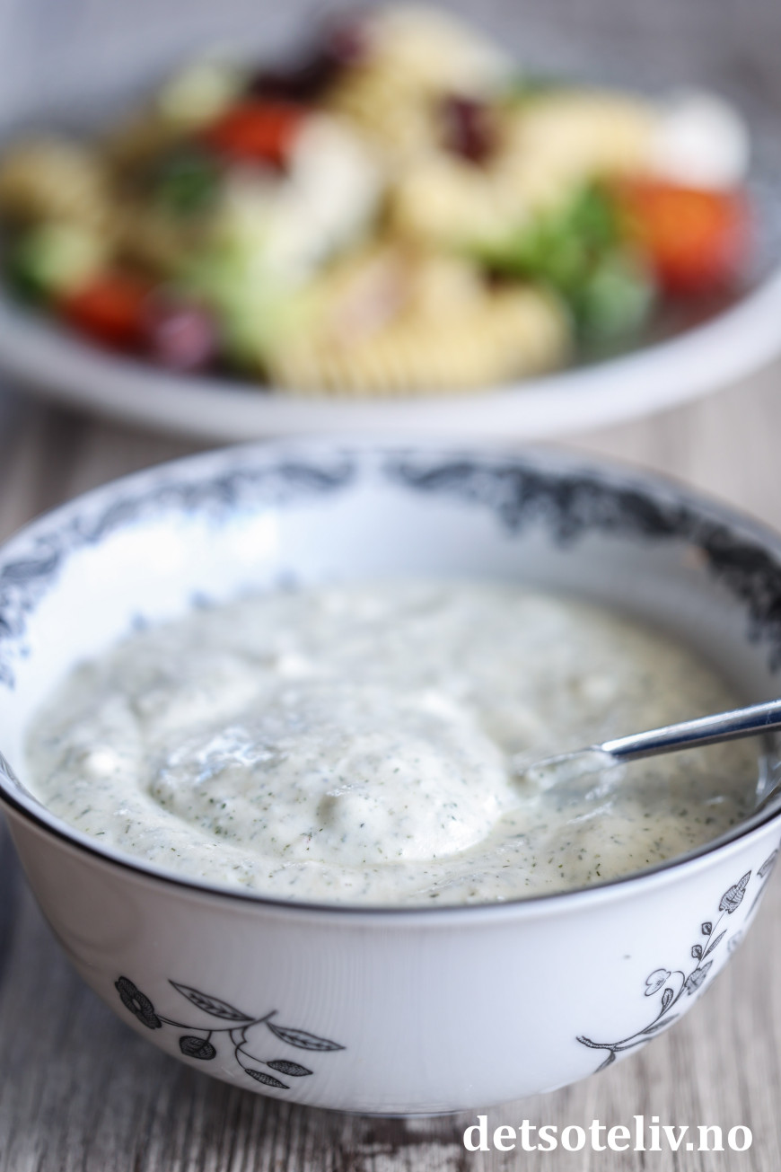 Denne dressingen får masse smak av presset hvitløk og dill!