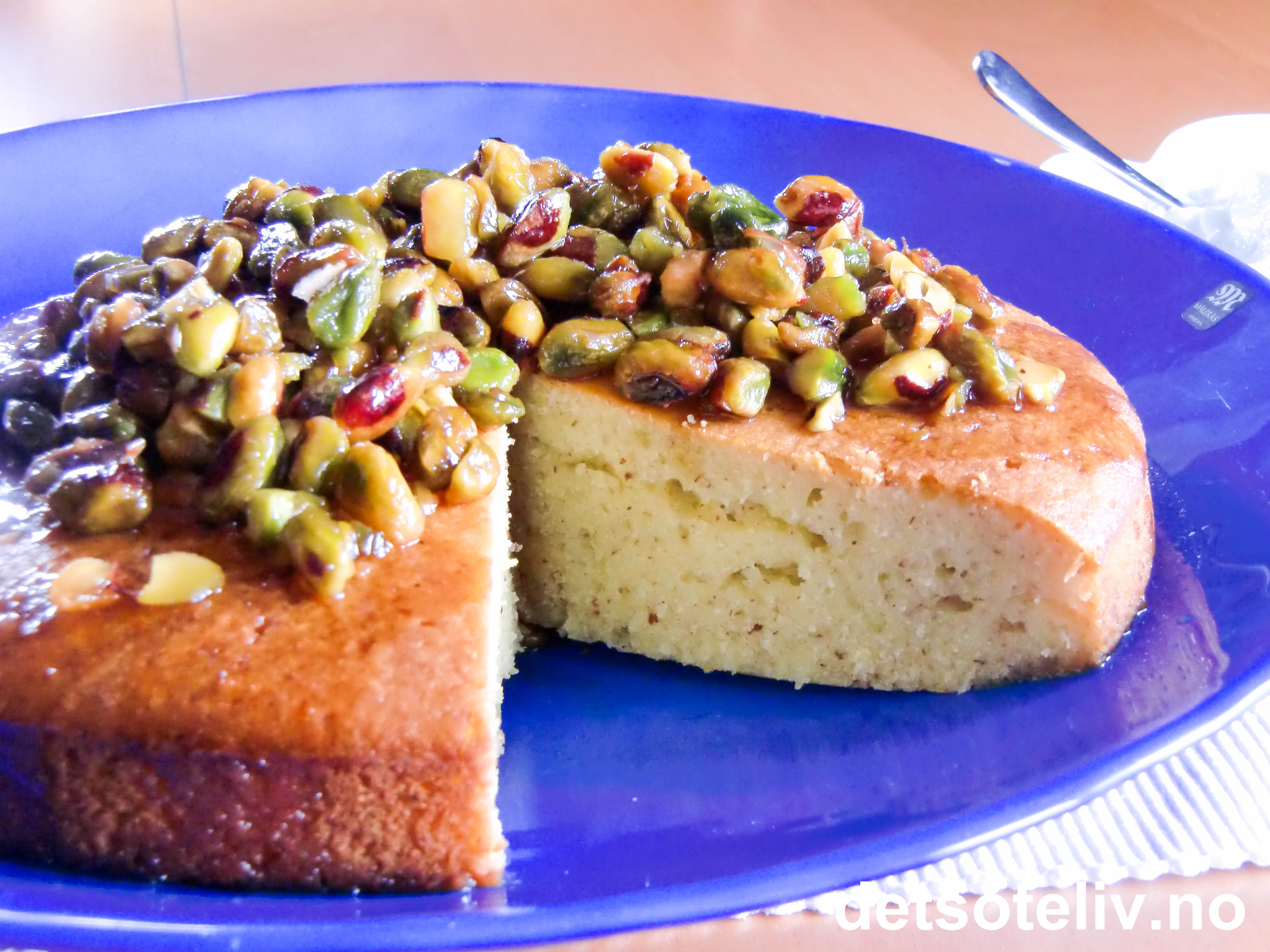 Her har du en kake som kommer fra herlige Hellas! Jeg elsker å befinne meg på en gresk øy, tusle rundt i smågatene og nyte synet av de kritthvite og blå husene med store, overfylte blomsterkasser foran. Så vakker og koselig atmosfære! Hellas har utrolig mye god mat å by på. Og ikke minst vidunderlige kaker! Denne oppskriften kommer fra Jamie Oliver og gir FANTASTISK kake med typisk gresk stil! Kaken inneholder gresk yoghurt, som er mye tykkere enn den norske yoghurten. I tillegg inneholder den ingredienser som semulegryn, olivenolje, flytende honning, mandler og masse pistasjnøtter. Hele kaken gjennomtrekkes av en skjønn sitrussaus. En symfoni av herlige smaker!