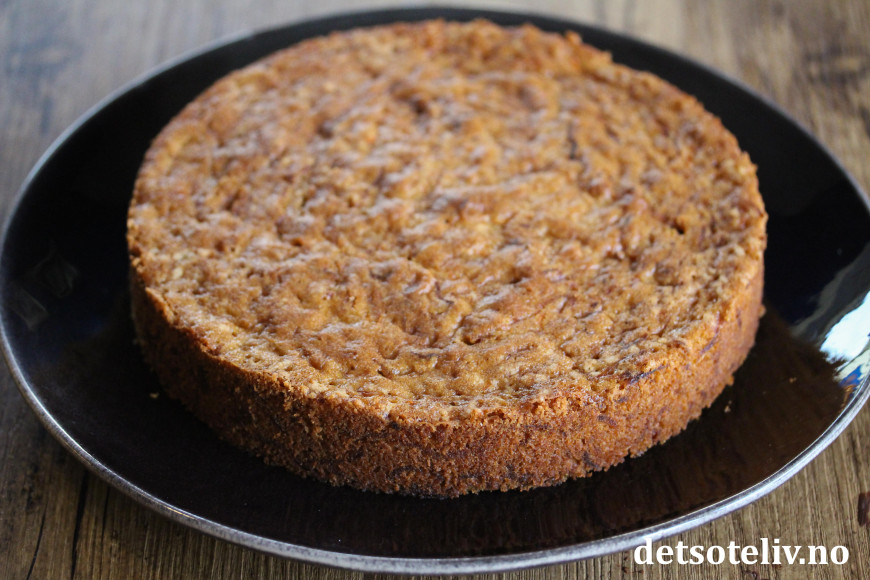 Ha deigen i en rund form (24 cm i diameter) med bakepapir i bunnen. Stek kaken nederst i ovnen ved 175°C i ca. 40 minutter. Avkjøl kaken i formen. Ta den ut av formen og fjern bakepapiret.