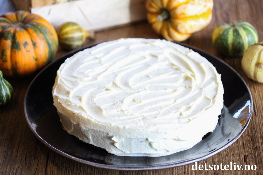 Fordel ostekremen over den avkjølte kaken. Pynt kaken med kakestrøssel hvis du vil.