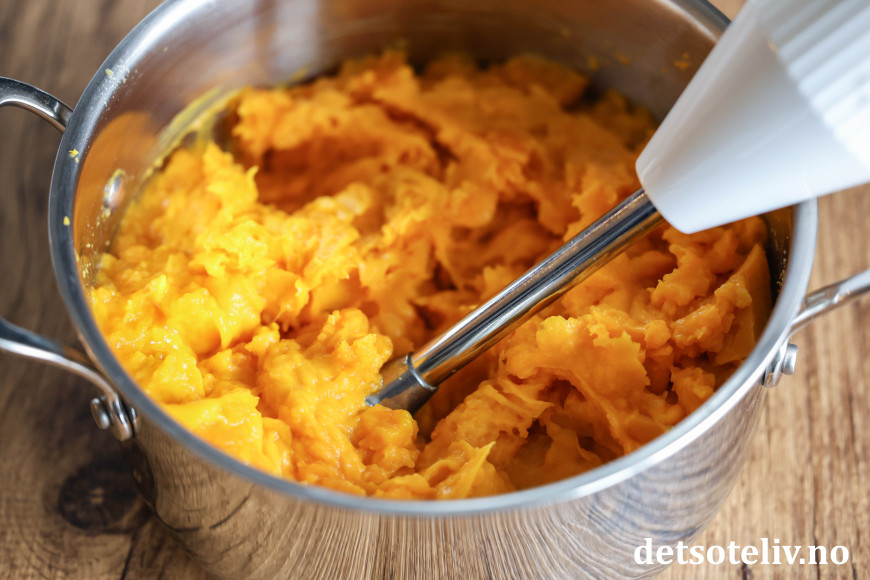 Del opp et lite gresskar. Damp gresskarkjøttet i en kjele med litt vann, til bitene har blitt helt møre. Mos bitene med en stavmikser eller i en food processor til en glatt mos.