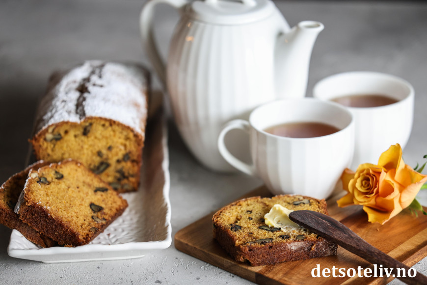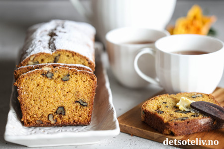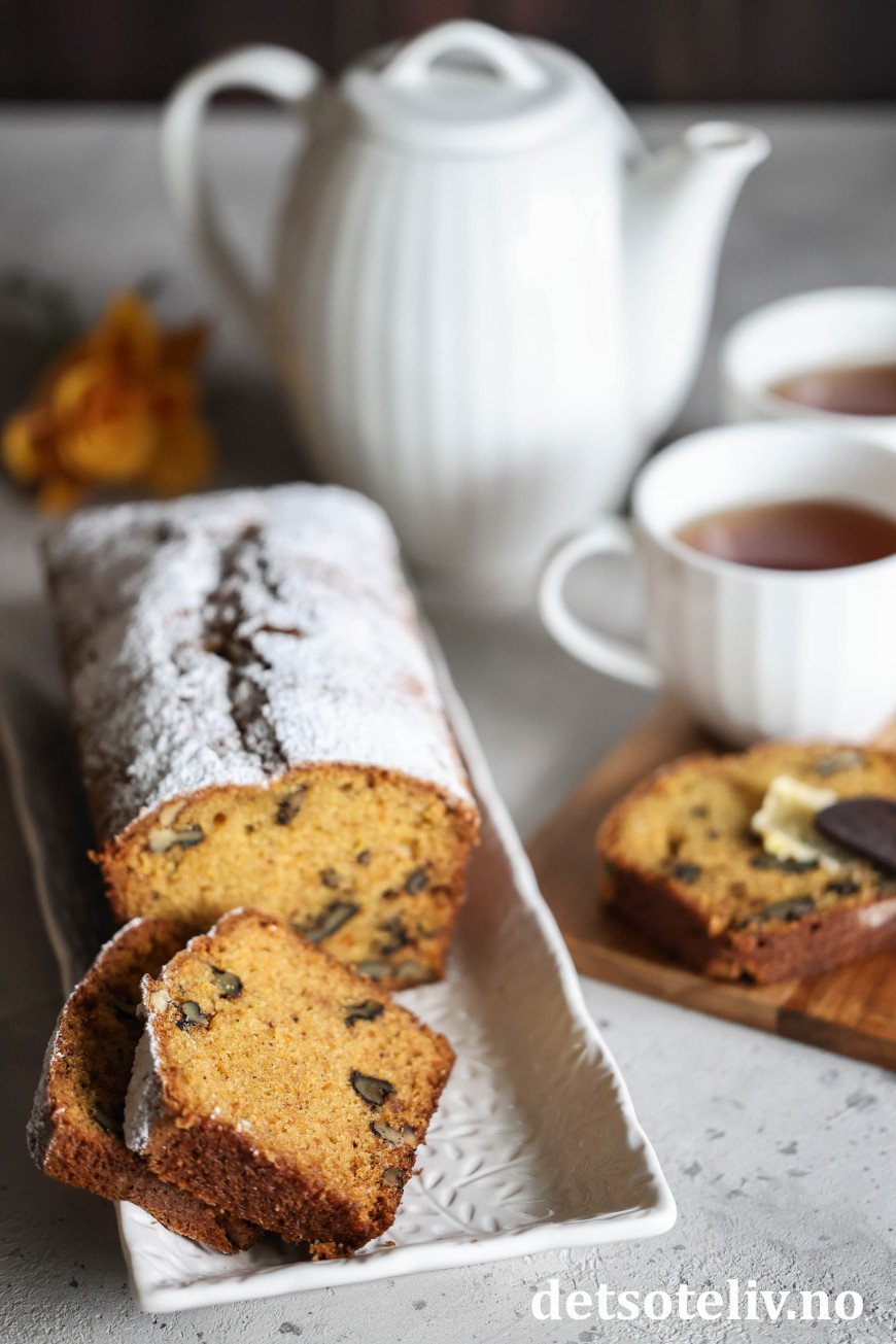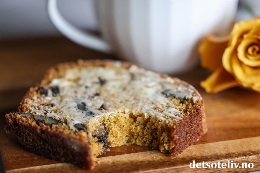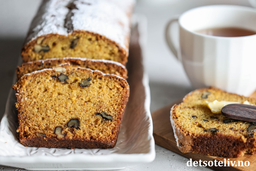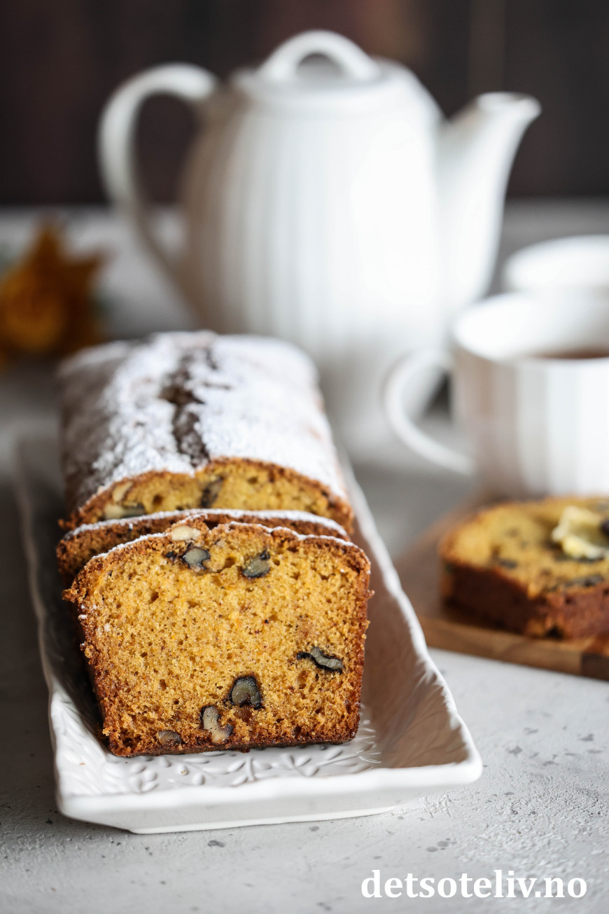 Du finner flere kjempeflotte oppskrifter med gresskar her på Det søte liv. Her kommer et tips til, som er en enkel, amerikansk formkake som lages med gresskarmos i deigen og masse hakkede valnøtter (Pumpkin Walnut Bread). Kaken er kjemperask å røre sammen, og blir saftig og veldig god!