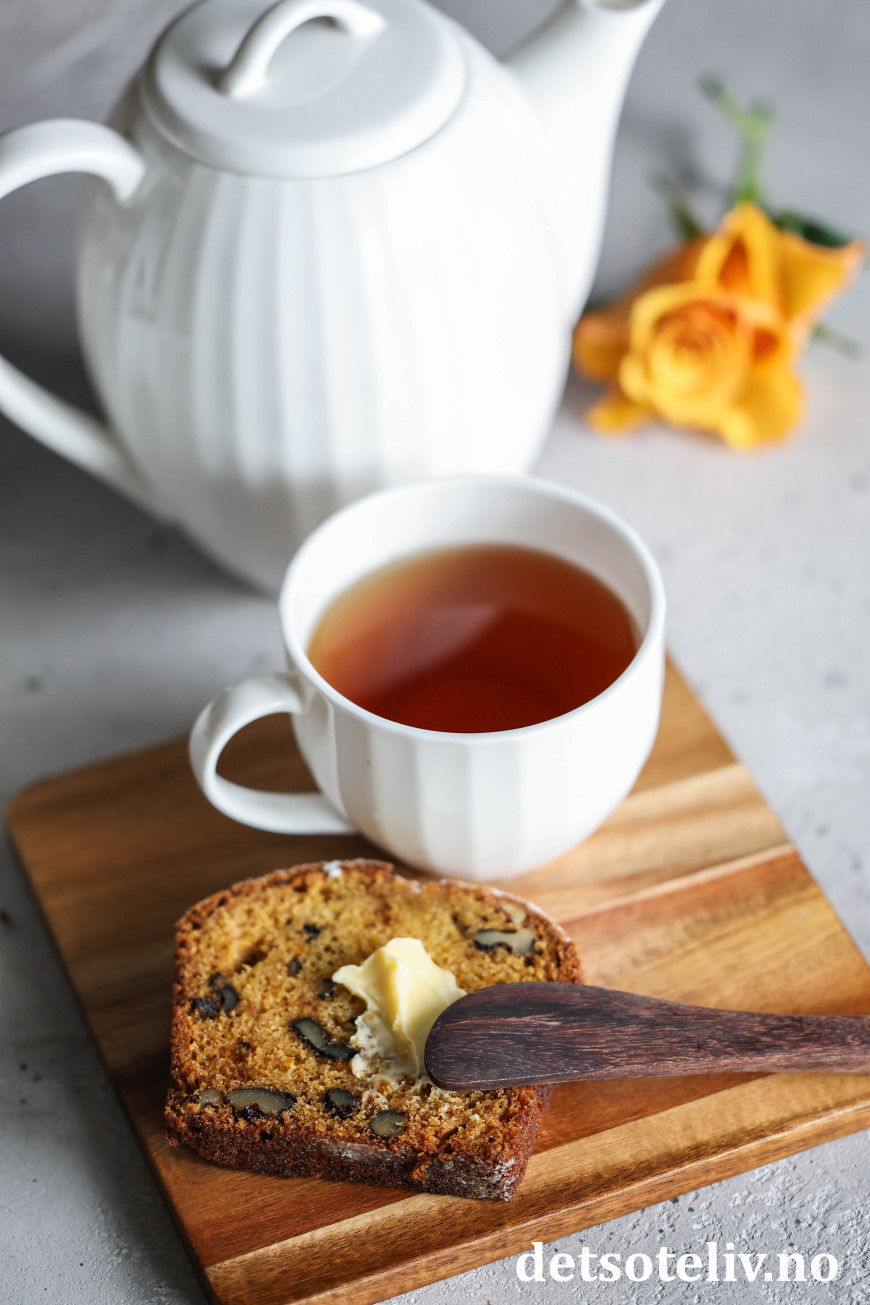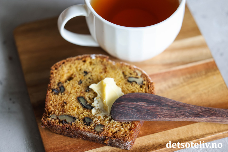 Kaken blir ikke altfor søt, og kakeskivene kan gjerne severes varme med litt smør eller kremost på.