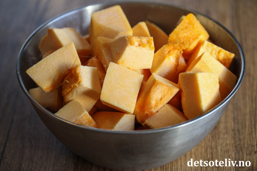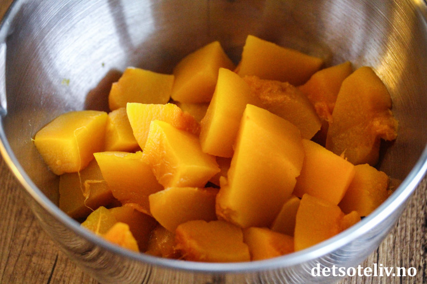 Damp gresskarkjøttet i en kjele med litt vann, til bitene har blitt helt møre.