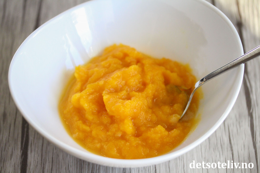 Pisk egg og sukker til tykk eggedosis. Rør inn gresskarmosen.